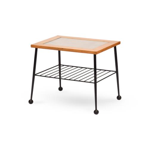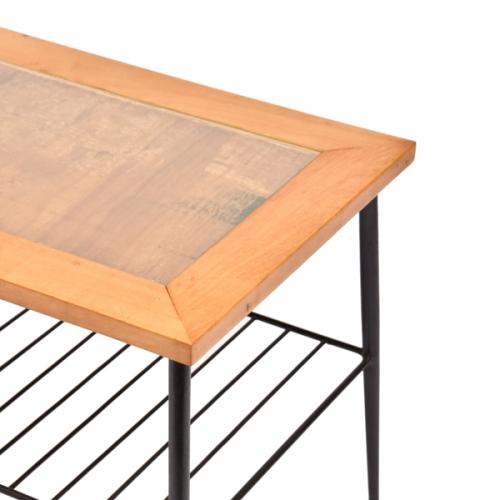MESA AUXILIAR ESTILO REVISTEIRO RÚSTICO COM ESTRUTURA EM FERRO PRETO E TAMPO EM MADEIRA-DEC 60